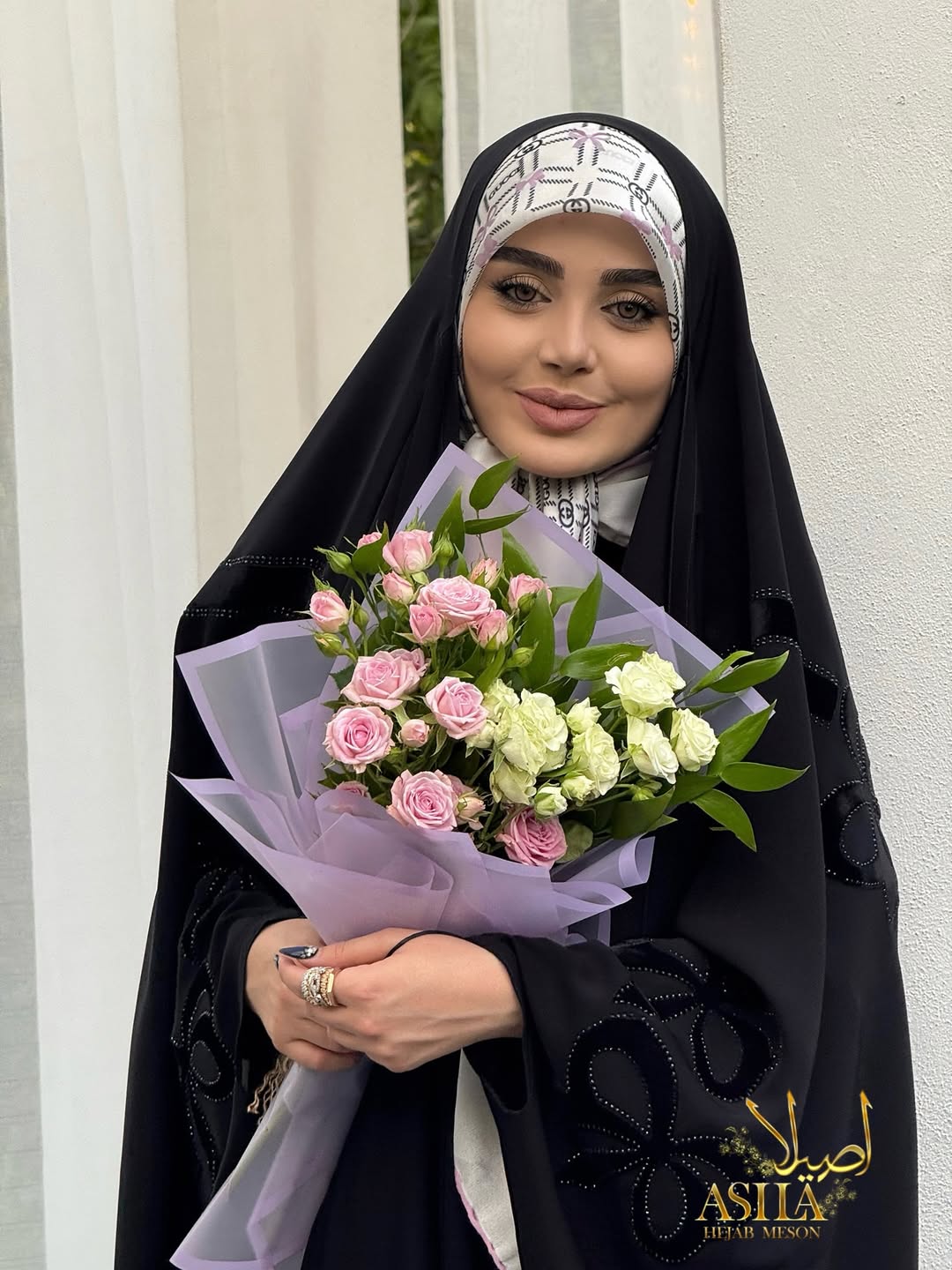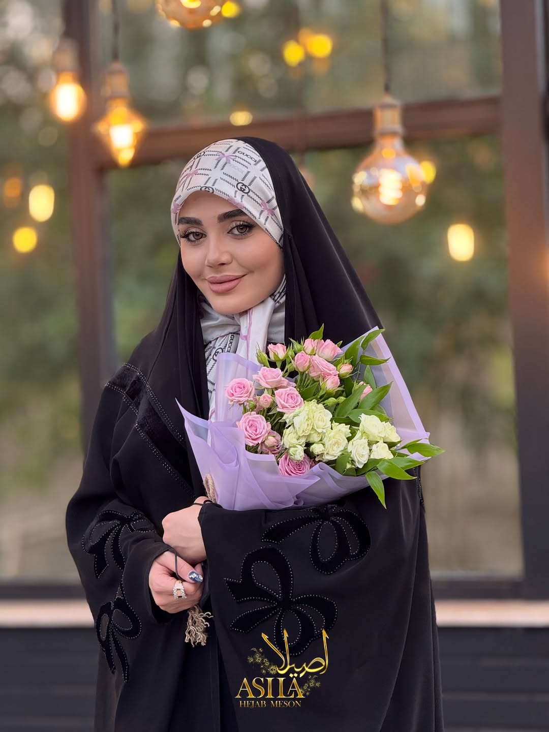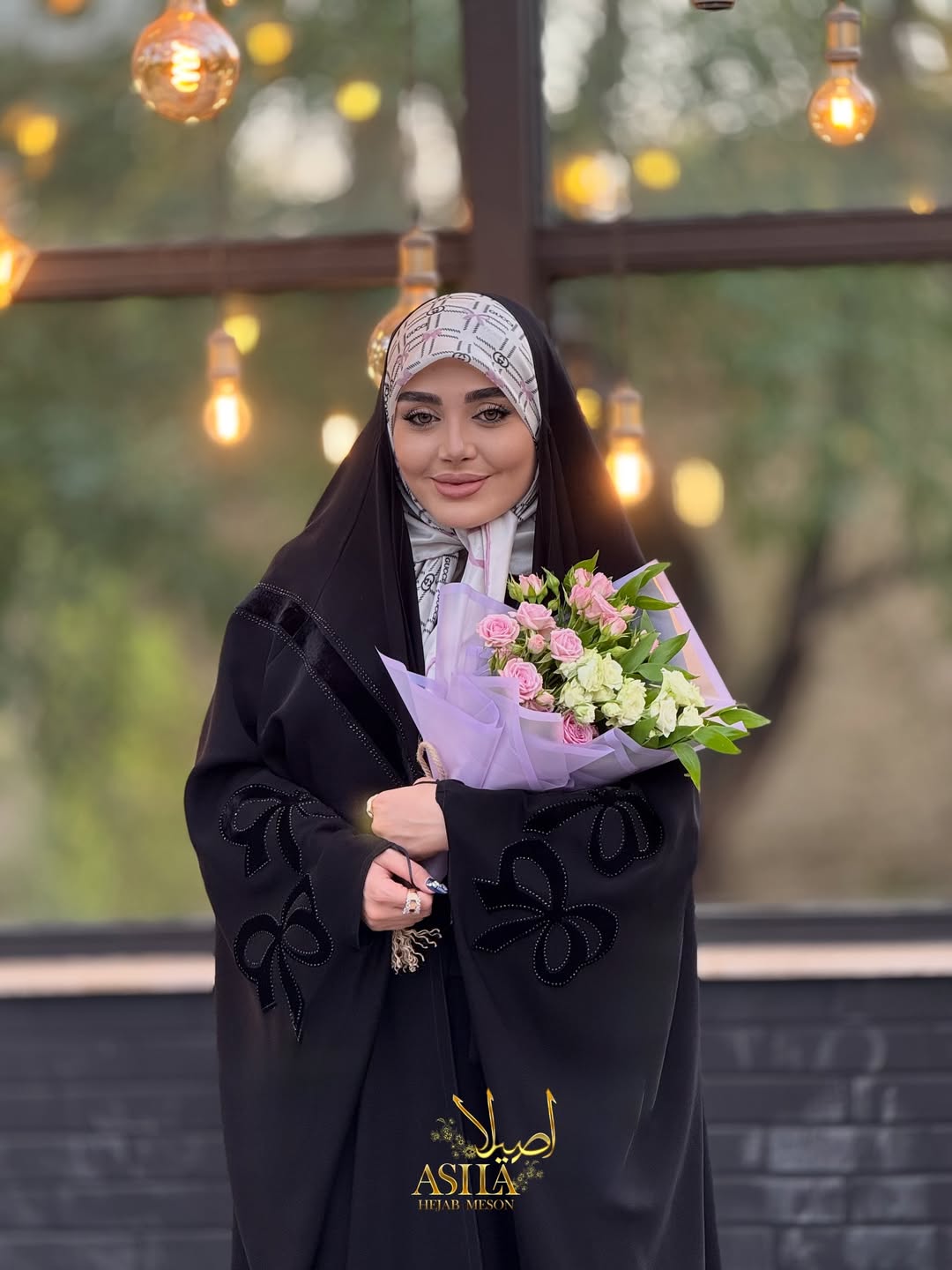 قشنگترین و دلبرترین پاپیونی دنیا جنس پارچه حریرابریشم کاملا مشکی و ریزش دار و سبک مخمل های استفاده شده مخمل کره و نگین های مشکی پرس شده روی چادر که ریزش ندارن
