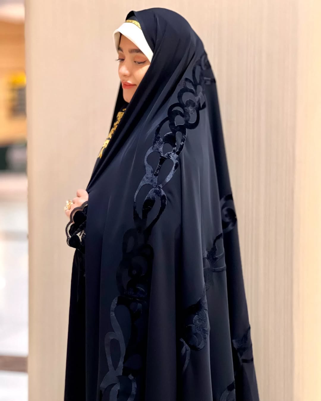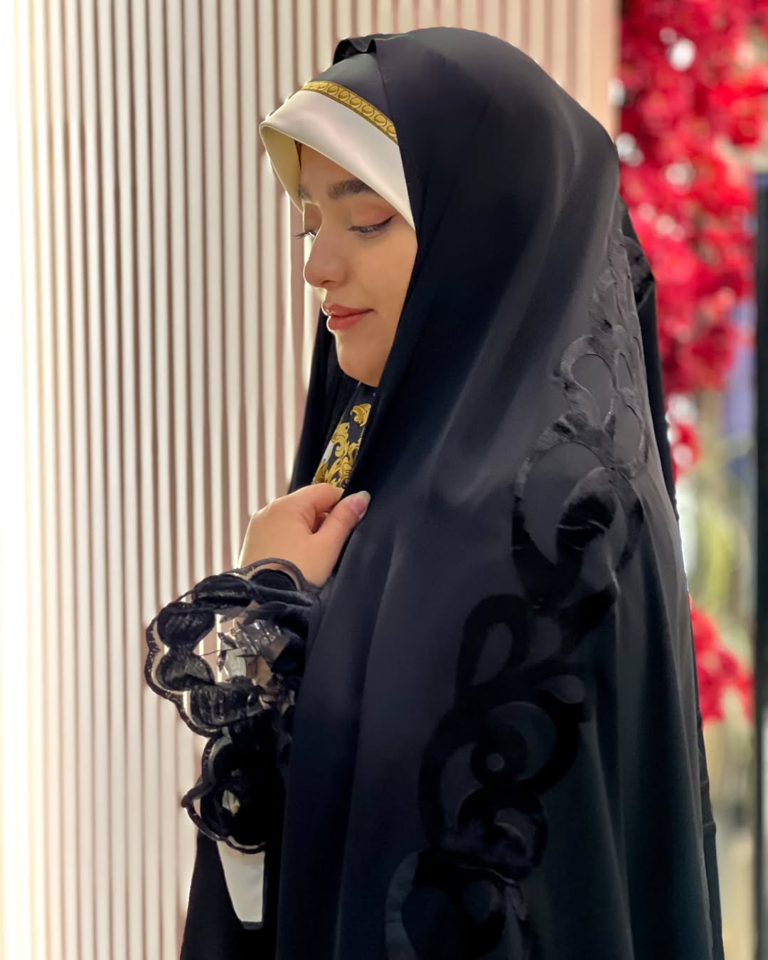 چادر سنتی مخلکوبی با یه طرح خاص و یه پارچه فوق العاده ریزش دار نیمه براق کاملا مشکی. عرض پارچه 175 هست پشت چادر یک تیکه درمیاد.